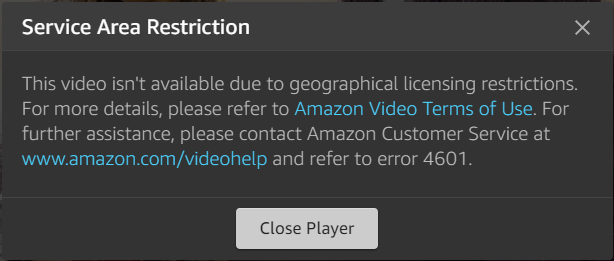 Ko sem hotel gledati Amazon Video vsebino preko www.amazon.com, sem dobil za večino video vsebine pojavno okno Service Area Restriction. In imel sem kar nekaj problemov, ker nisem vedel, kaj lahko gledam, česa pa ne. Pogosto se namreč zgodi, da določene vsebine ne morem gledati v Sloveniji. Tako si na primer lahko ogledam video vsebino The Grand Tour, ne morem pa si ogledati TV serije Vikings.