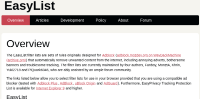 EasyList običajno označuje (čeprav je “EasyList” primarni blokirni seznam) zbirko blokirnih seznamov, ki jih vzdržujejo glavni skrbniki EasyList in prispeva skupnost. EasyList je izjemno priljubljen in učinkovit; to je eden od seznamov za blokiranje oglasov, ki je naložen v zelo cenjen in učinkovit širokospektralni blokator oglasov/sledilcev, uBlock Origin.