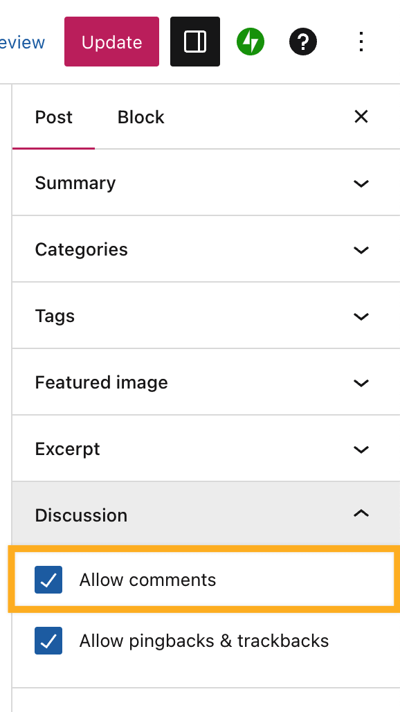 - Pomaknite se navzdol do razdelka Razprava v nastavitvah objave/strani.
